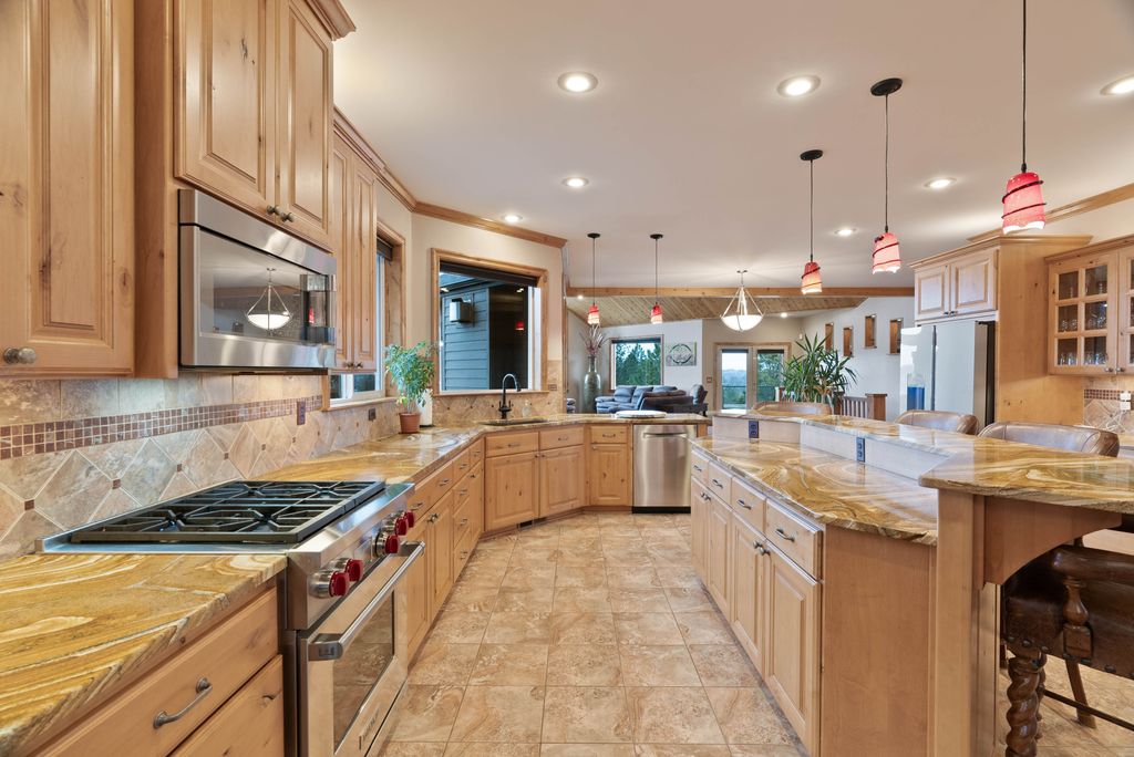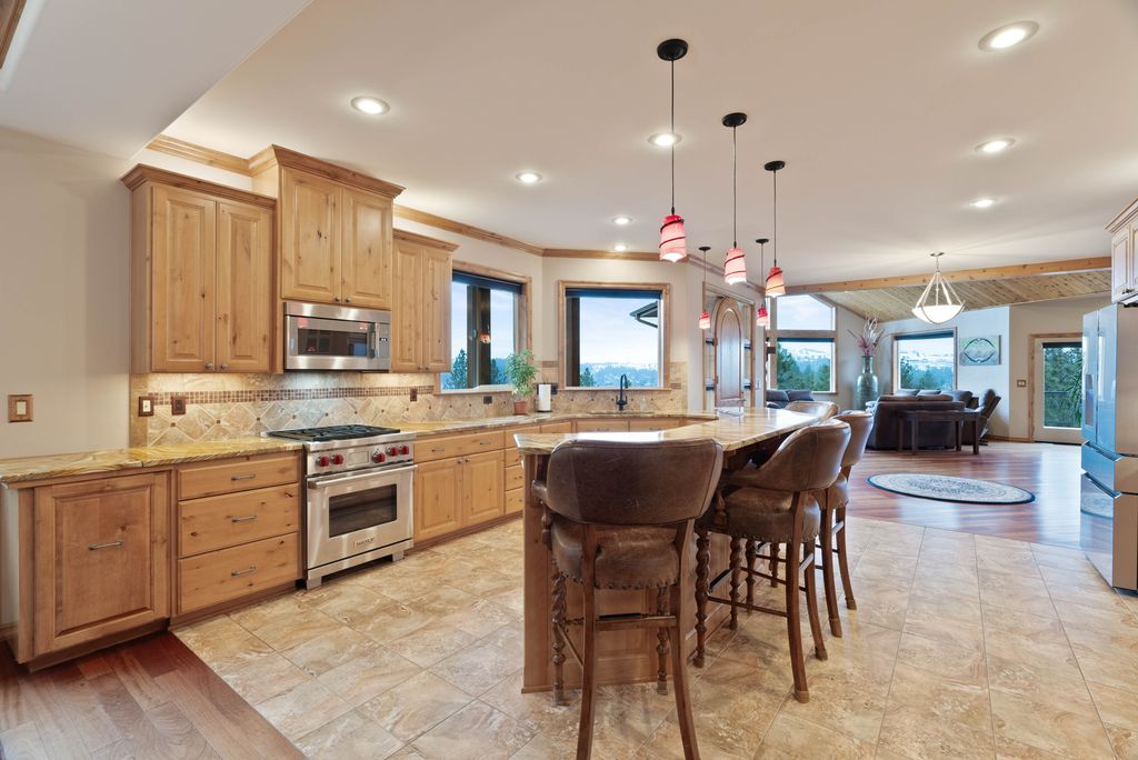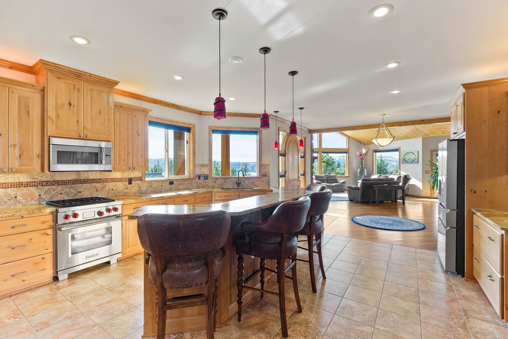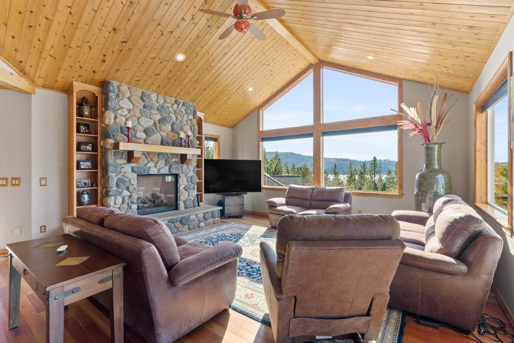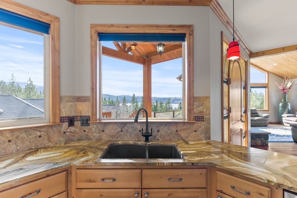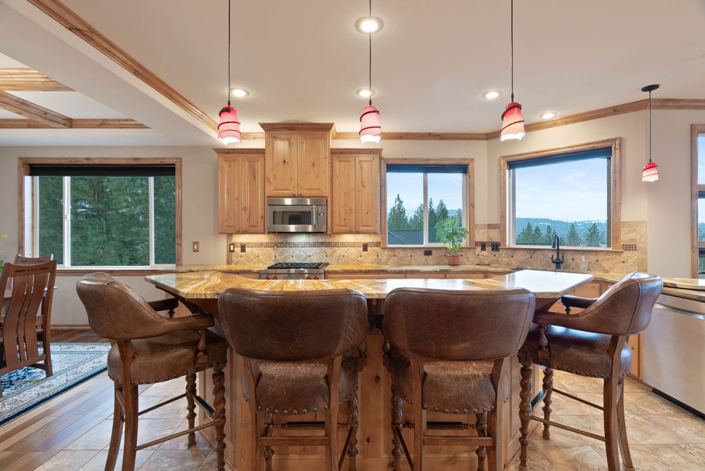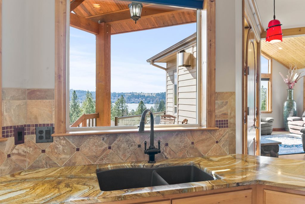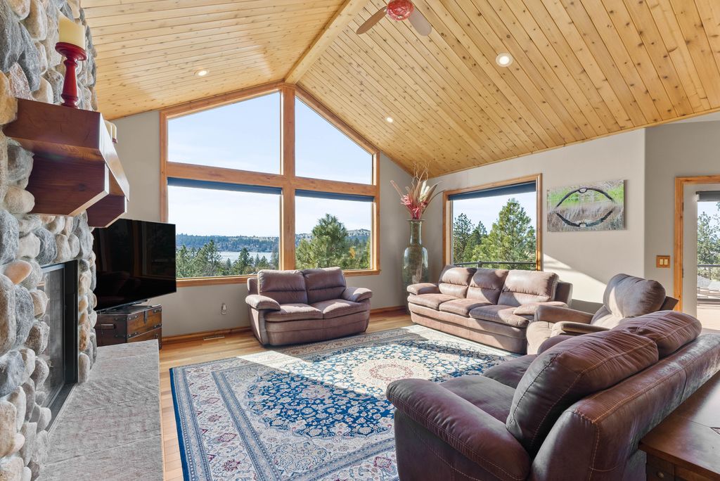 This custom-built home offers stunning vistas of Liberty Lake, Mica Peak, and golf courses. The updated kitchen features a Wolf range, refrigerator, mini-fridge, microwave, and quartz countertops. Architectural details like box beam ceilings, crown molding, cedar T&G ceilings, and Brazilian cherry floors make this home an entertainer’s dream. The spacious primary suite is a serene retreat with a large double-head shower, custom tile counters, and a walk-in closet. The lower level boasts two bedrooms, a bath,custom golf simulator room—perfect for leisure or practice, and access to a covered patio. The outdoor entertaining area includes a covered pergola, a fire pit, and expansive patios—perfect for enjoying summer barbecues and cozy eveningsall set against the stunning backdrop of Liberty Lake and golf course greens. Nestled in Liberty Lake, this home offers tranquility with convenient access to shopping, dining, recreation, and just 15 min. to Coeur d' Alene. Book your private showing today!