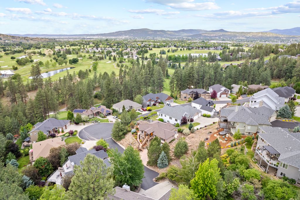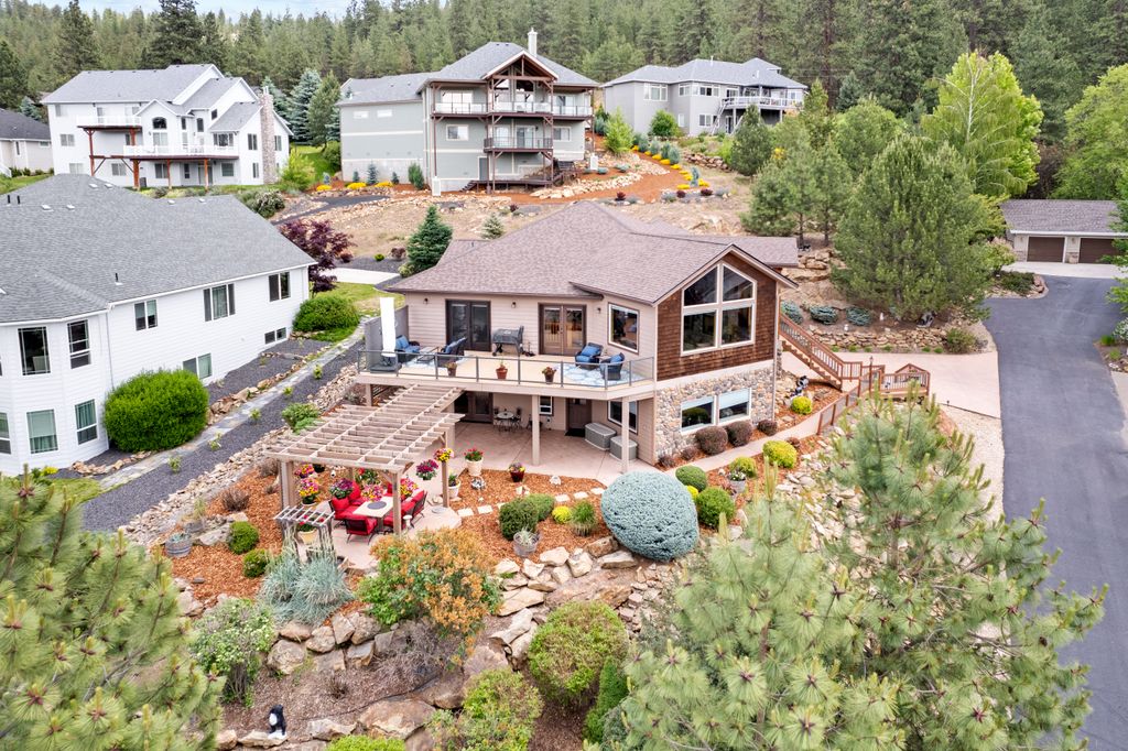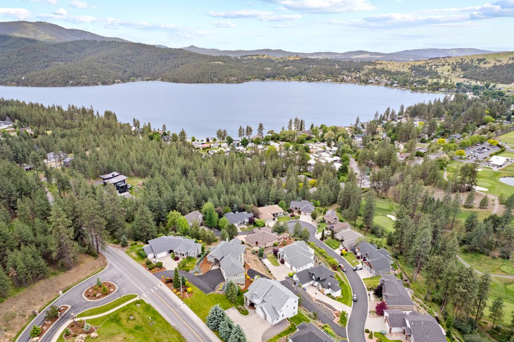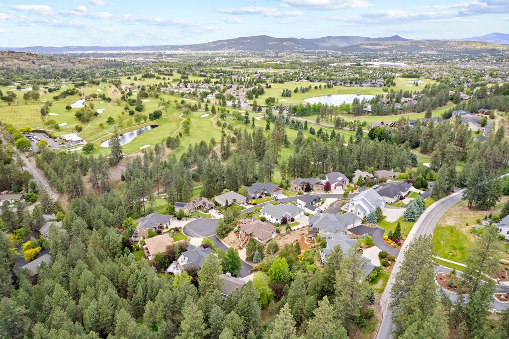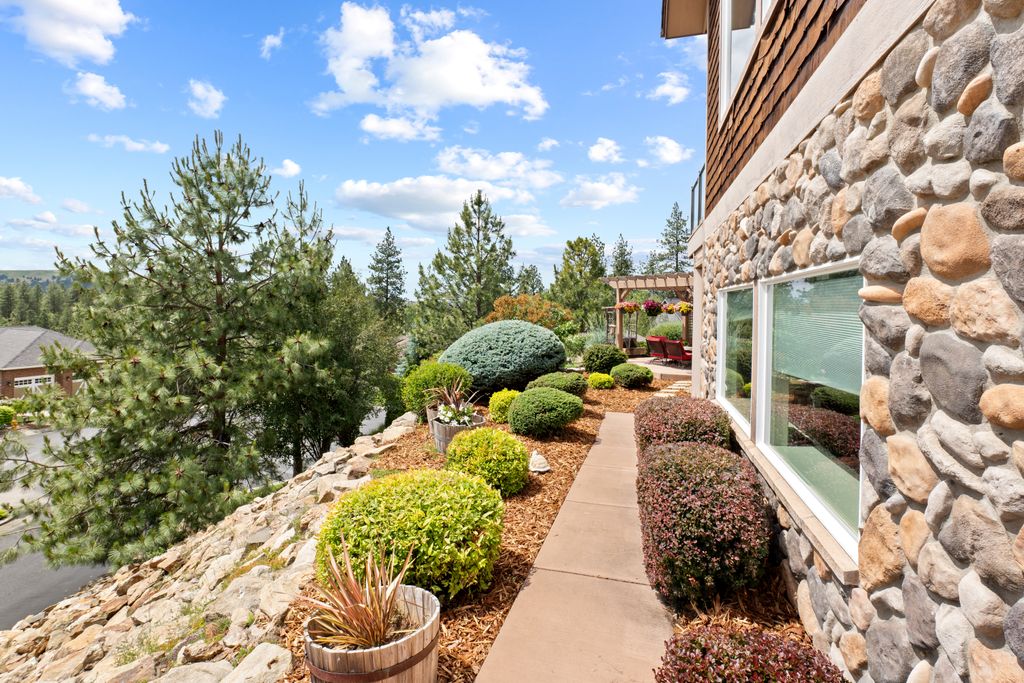 This custom-built home offers stunning vistas of Liberty Lake, Mica Peak, and golf courses. The updated kitchen features a Wolf range, refrigerator, mini-fridge, microwave, and quartz countertops. Architectural details like box beam ceilings, crown molding, cedar T&G ceilings, and Brazilian cherry floors make this home an entertainer’s dream. The spacious primary suite is a serene retreat with a large double-head shower, custom tile counters, and a walk-in closet. The lower level boasts two bedrooms, a bath,custom golf simulator room—perfect for leisure or practice, and access to a covered patio. The outdoor entertaining area includes a covered pergola, a fire pit, and expansive patios—perfect for enjoying summer barbecues and cozy eveningsall set against the stunning backdrop of Liberty Lake and golf course greens. Nestled in Liberty Lake, this home offers tranquility with convenient access to shopping, dining, recreation, and just 15 min. to Coeur d' Alene. Book your private showing today!