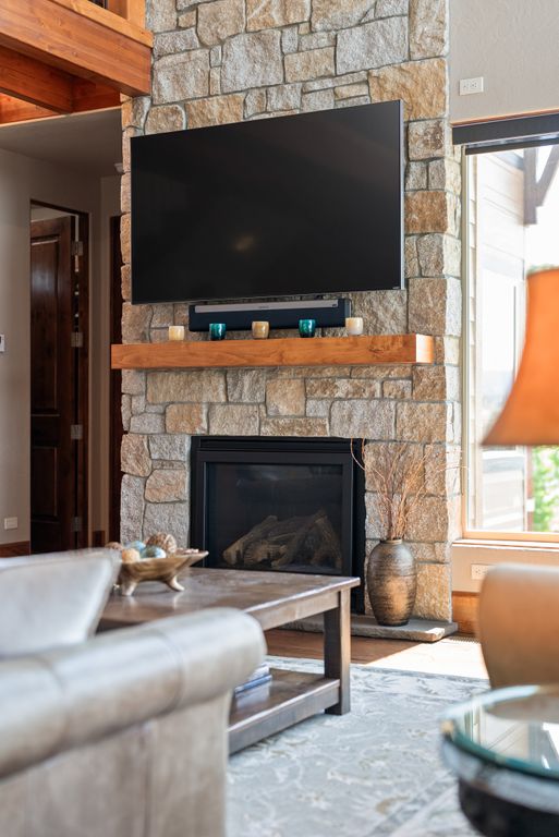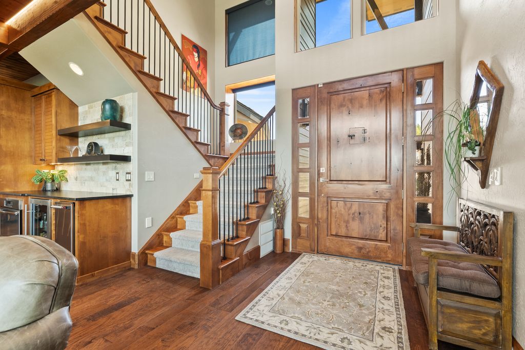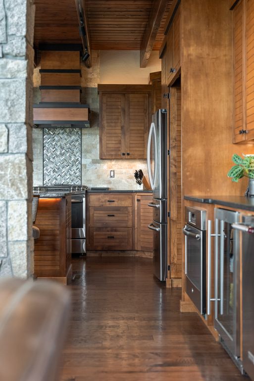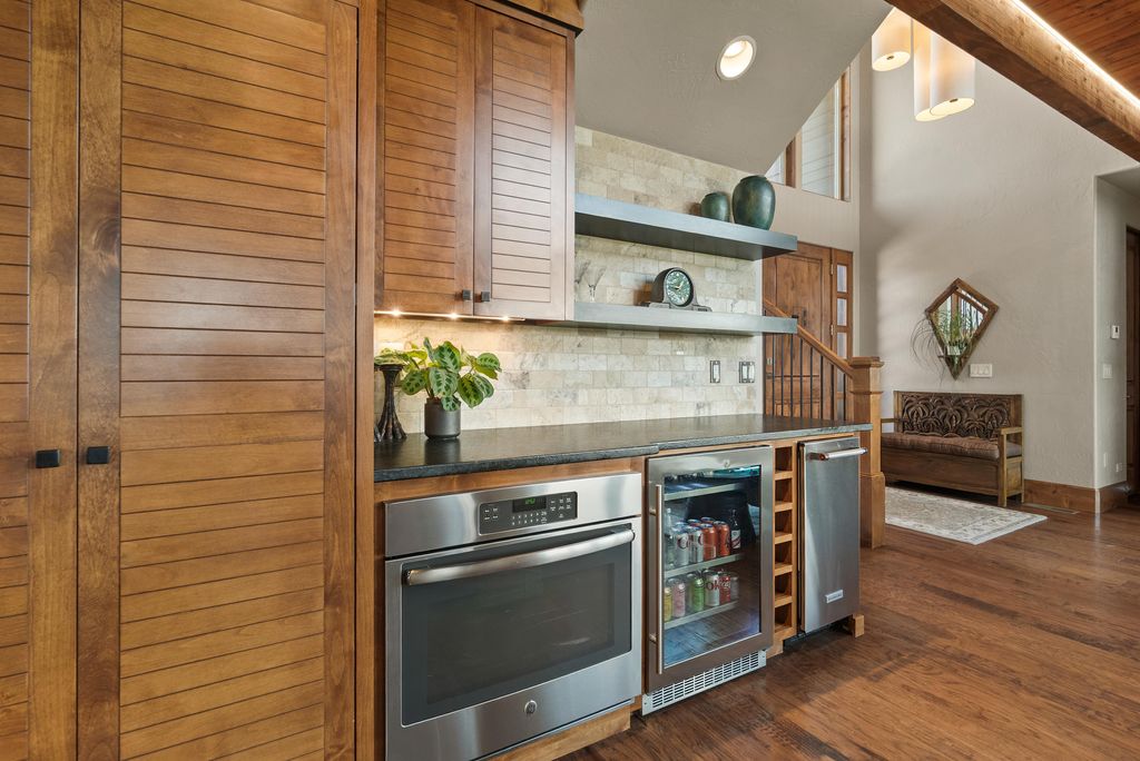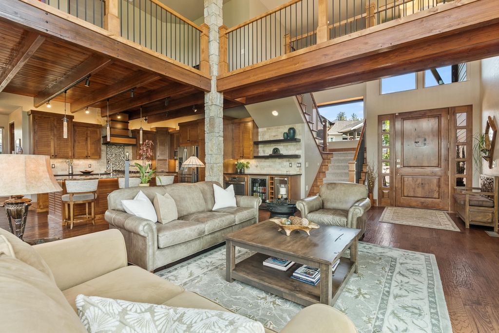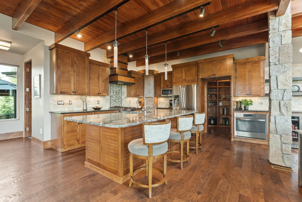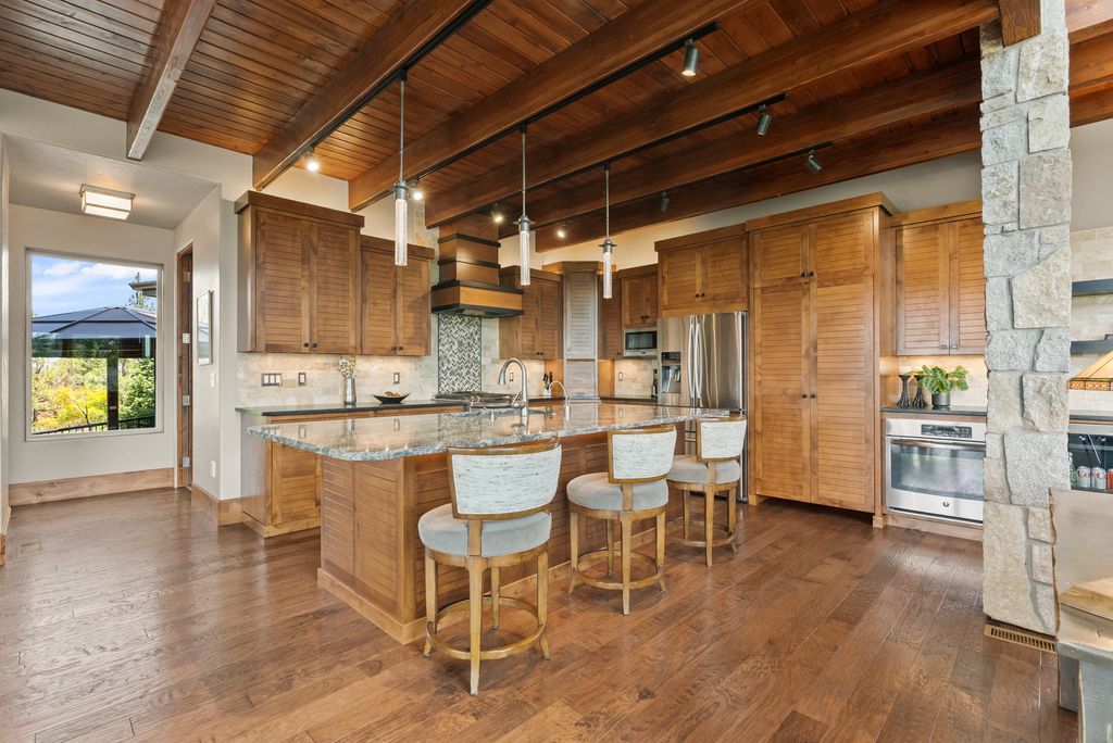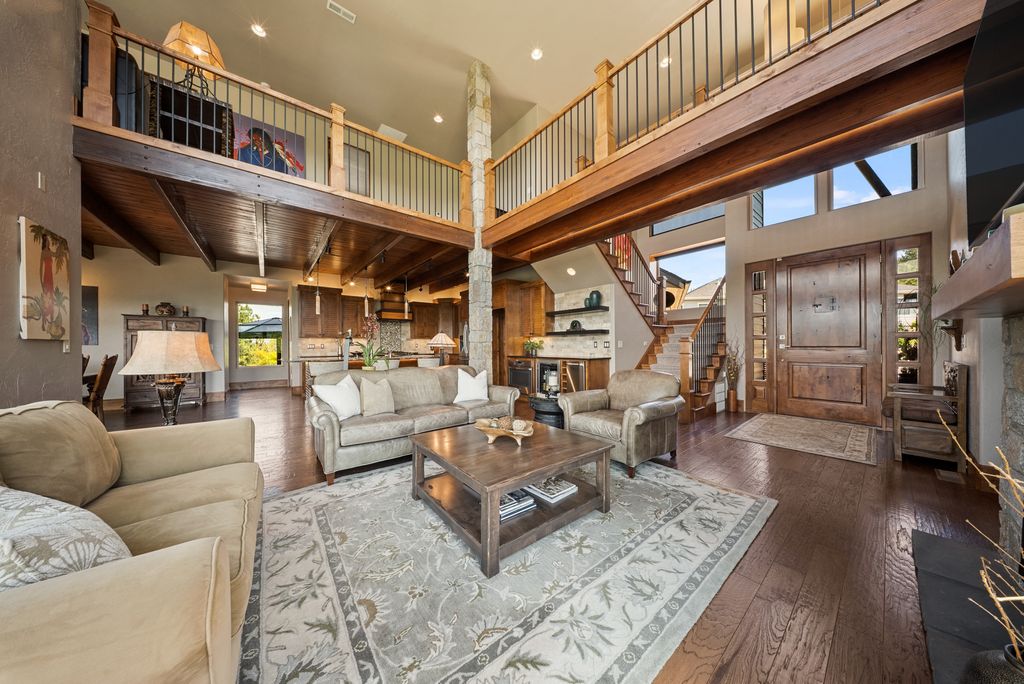 Inside, you'll find soaring 19-foot ceilings, triple-pane tinted windows, engineered hickory hardwood floors, and custom finishes including knotty alder doors and clear alder cabinetry. The chef's kitchen features quartz and granite countertops, dual ovens (gas and electric), a wine fridge and ice maker, and a hidden walk-in pantry. All appliances and TVs stay with the home.