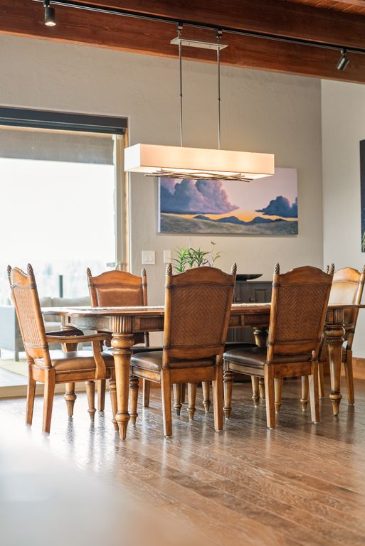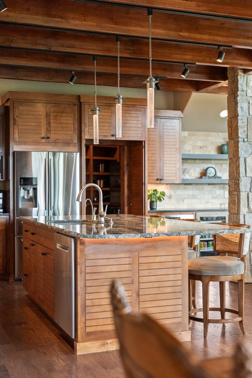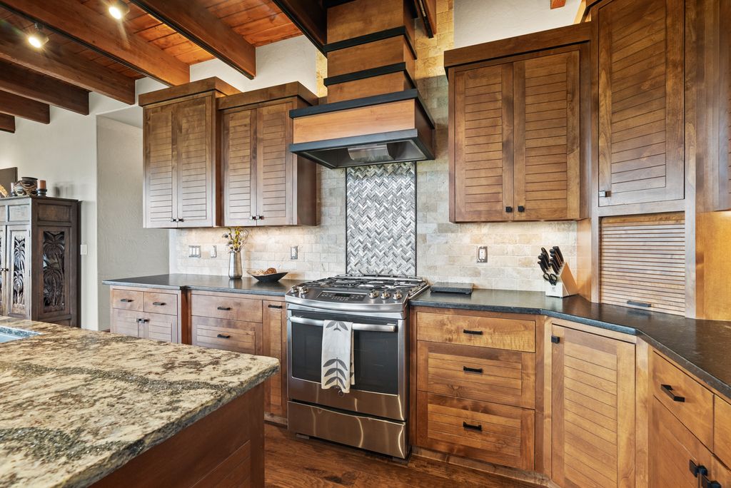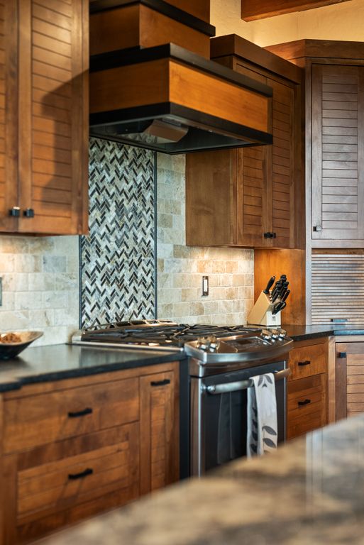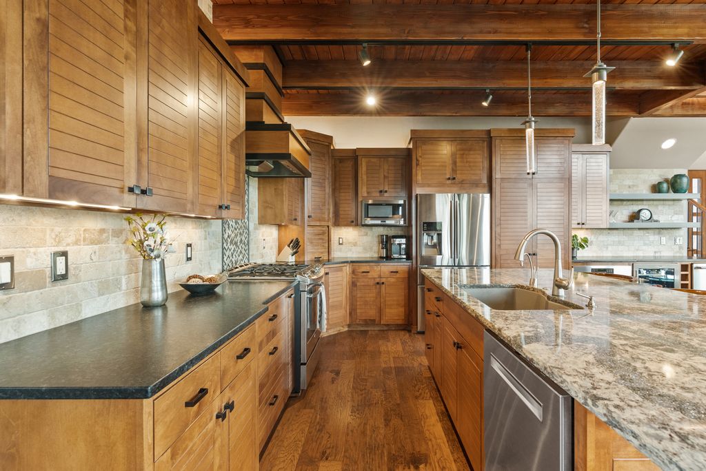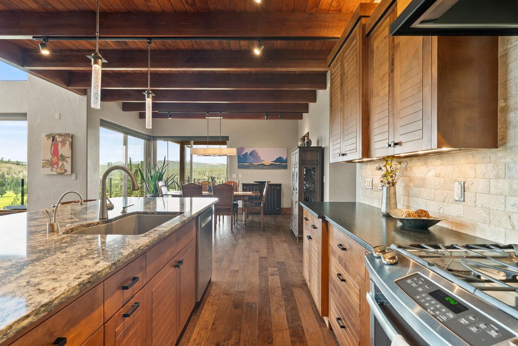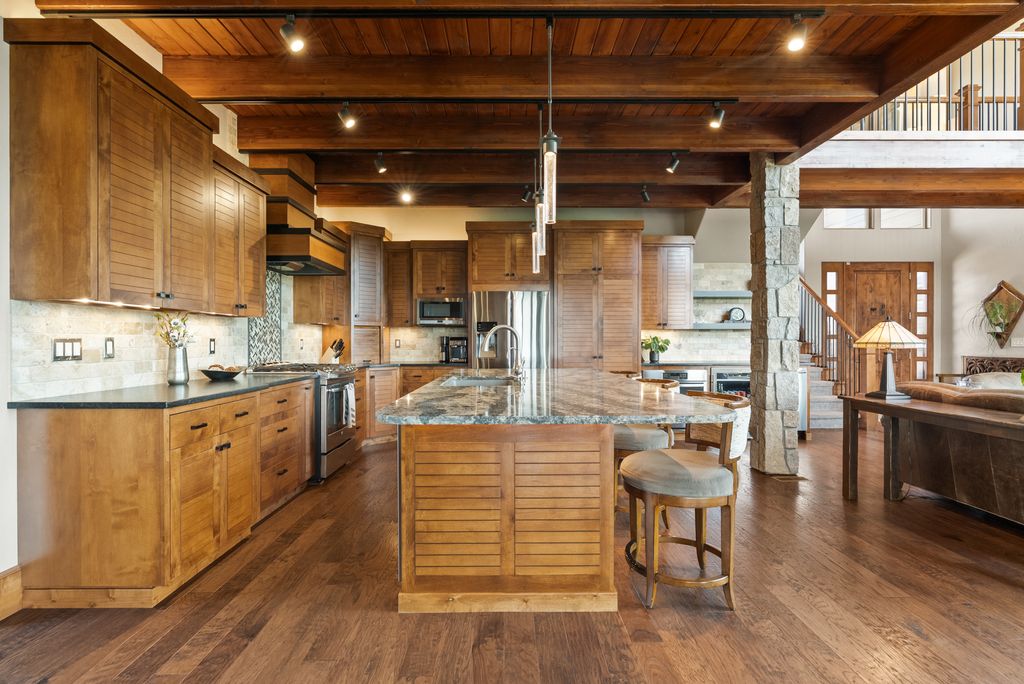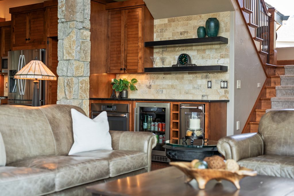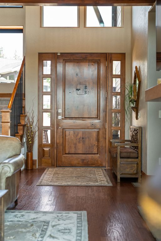 Inside, you'll find soaring 19-foot ceilings, triple-pane tinted windows, engineered hickory hardwood floors, and custom finishes including knotty alder doors and clear alder cabinetry. The chef's kitchen features quartz and granite countertops, dual ovens (gas and electric), a wine fridge and ice maker, and a hidden walk-in pantry. All appliances and TVs stay with the home.