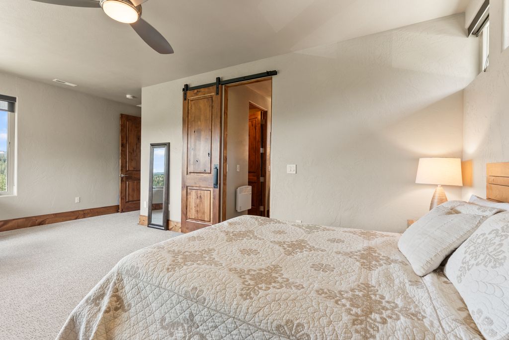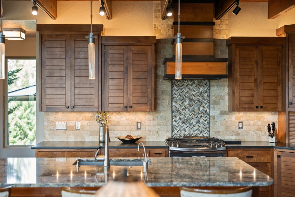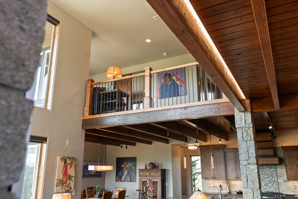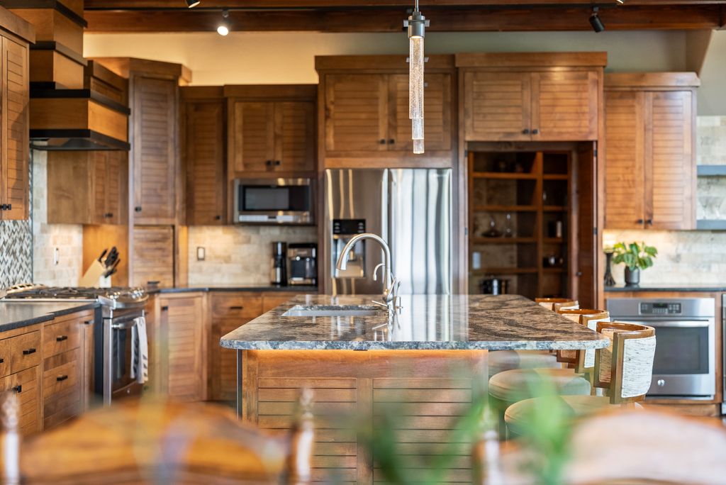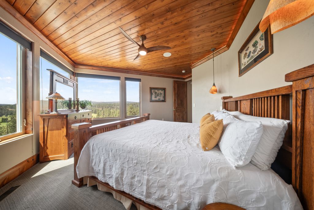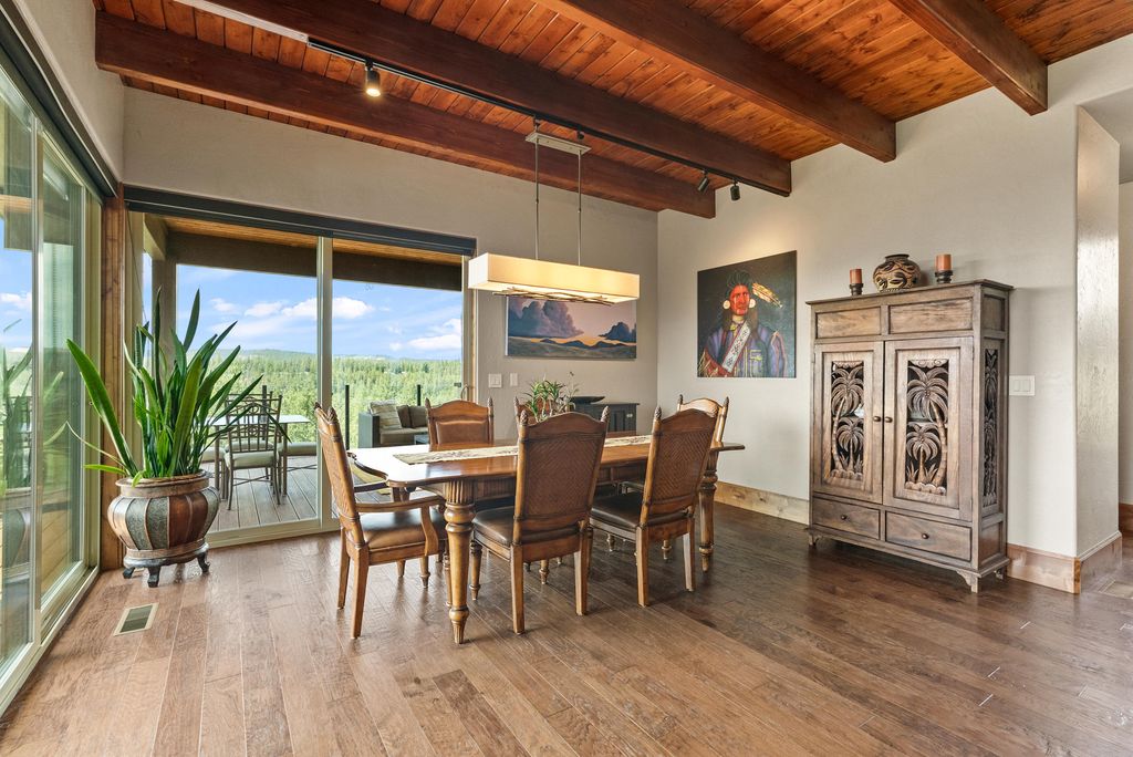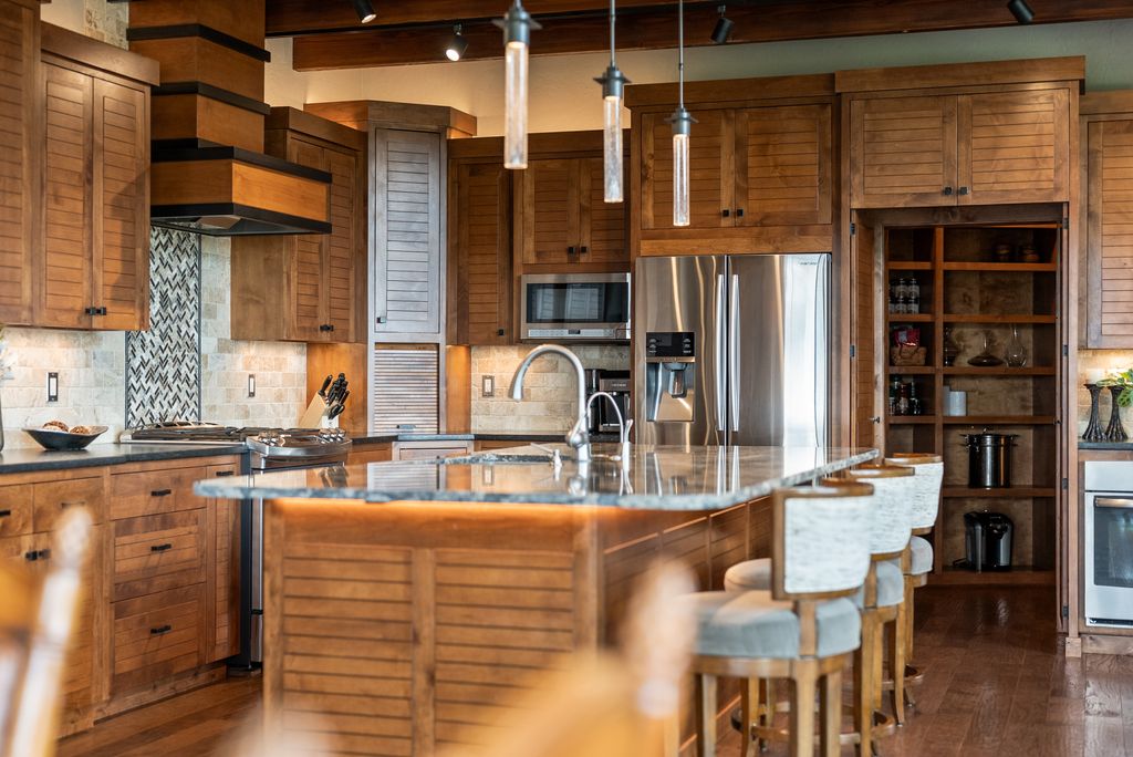 Inside, you'll find soaring 19-foot ceilings, triple-pane tinted windows, engineered hickory hardwood floors, and custom finishes including knotty alder doors and clear alder cabinetry. The chef's kitchen features quartz and granite countertops, dual ovens (gas and electric), a wine fridge and ice maker, and a hidden walk-in pantry. All appliances and TVs stay with the home.