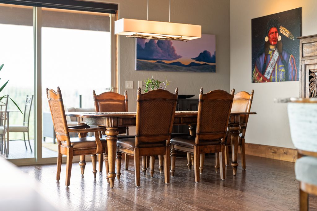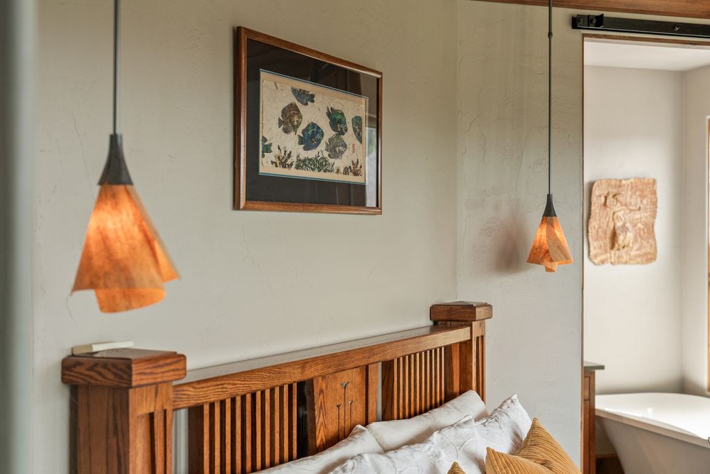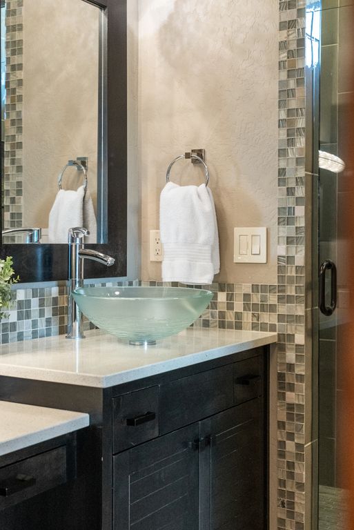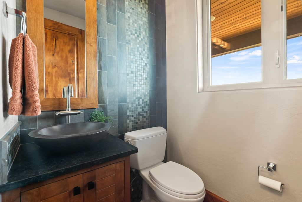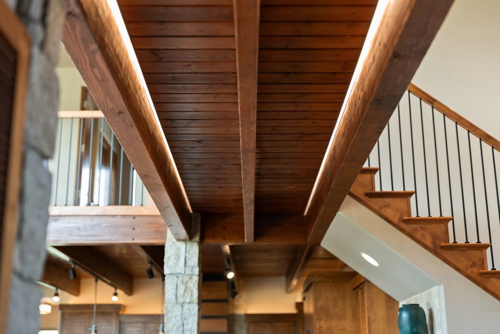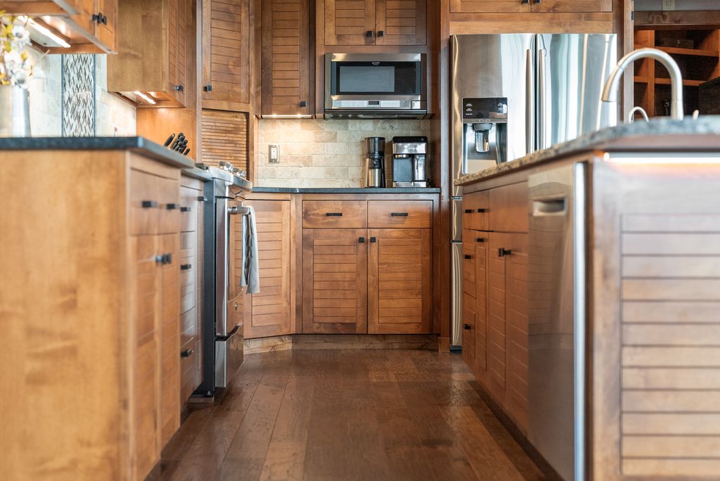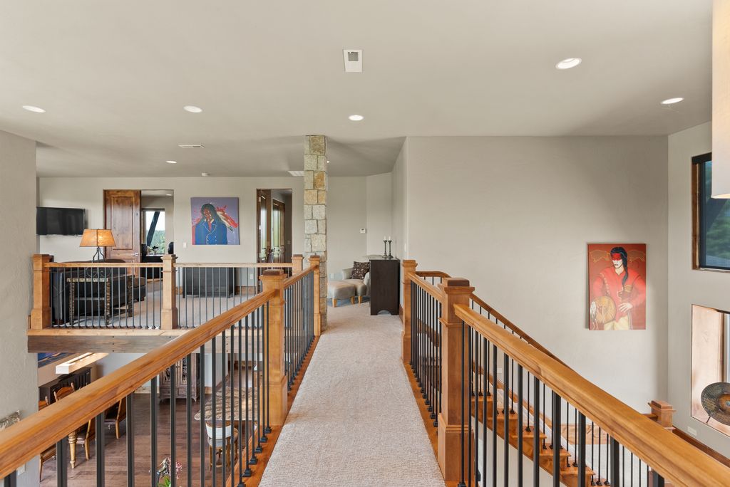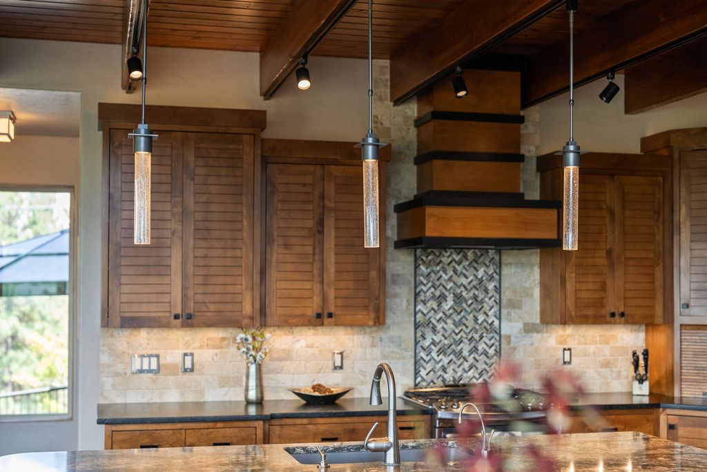 Inside, you'll find soaring 19-foot ceilings, triple-pane tinted windows, engineered hickory hardwood floors, and custom finishes including knotty alder doors and clear alder cabinetry. The chef's kitchen features quartz and granite countertops, dual ovens (gas and electric), a wine fridge and ice maker, and a hidden walk-in pantry. All appliances and TVs stay with the home.