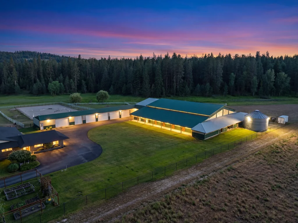 Welcome to Crescent Bend Farm, a meticulously cared for equestrian estate on 20.03 serene acres in Chattaroy featuring a 4,200+ sq ft brick rancher with thoughtfully planned horse facilities for the professional or hobbyist alike. The 5 bed, 3 bath home offers a primary ensuite with dual sinks, a spacious kitchen, office, large mudroom, finished basement, multiple living spaces and covered patio that looks out over the lush, shaded lawn. The 60'x100' indoor arena features overhead lighting & mason sand/rubber footing as well as 5 stalls + foaling stall with power, drive-through hay/equipment storage, and heated tack & feed rooms. The 100’x200’ outdoor arena, round pen, almost 10 acres of fully fenced pasture, and 4 fenced paddocks complete the setup. The gated/paved driveway, year-round creek, and oversized 6-bay shop with EV hookup & backup diesel generator are but a few more of the endless amenities. This is a rare, turnkey opportunity for equestrians or anyone seeking refined rural living just minutes from Spokane.