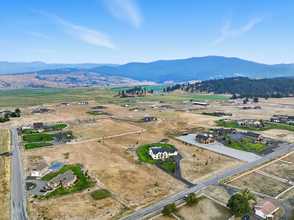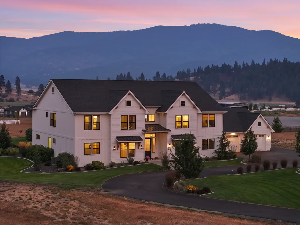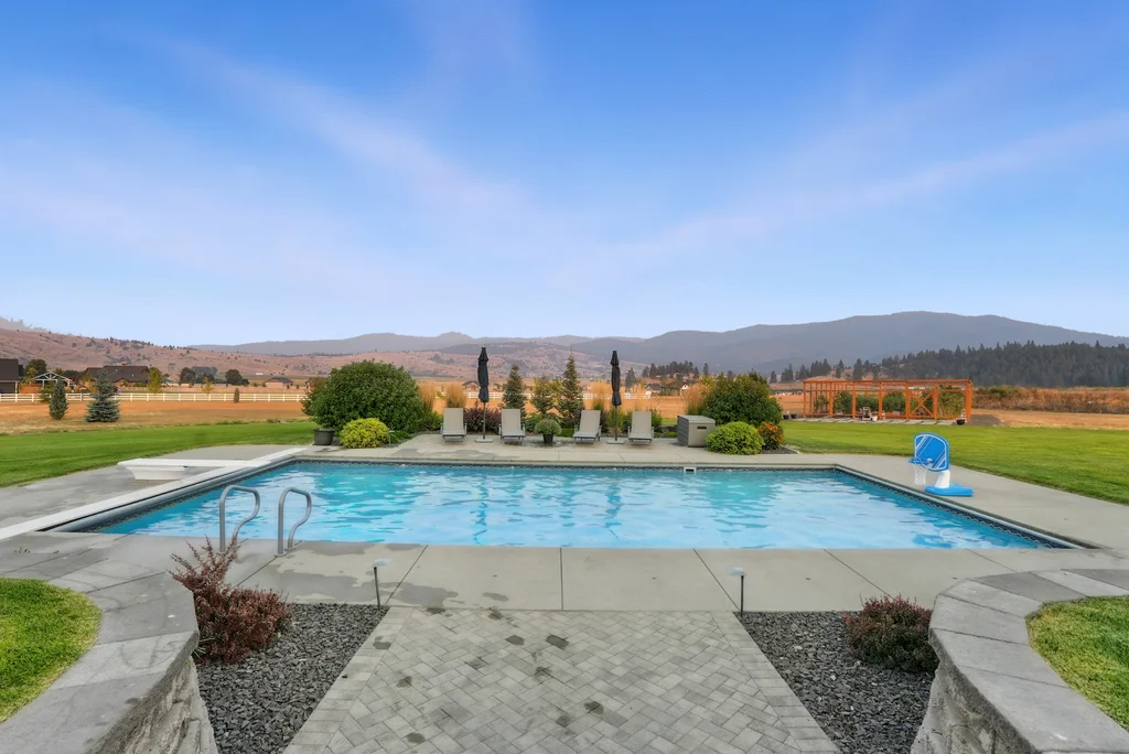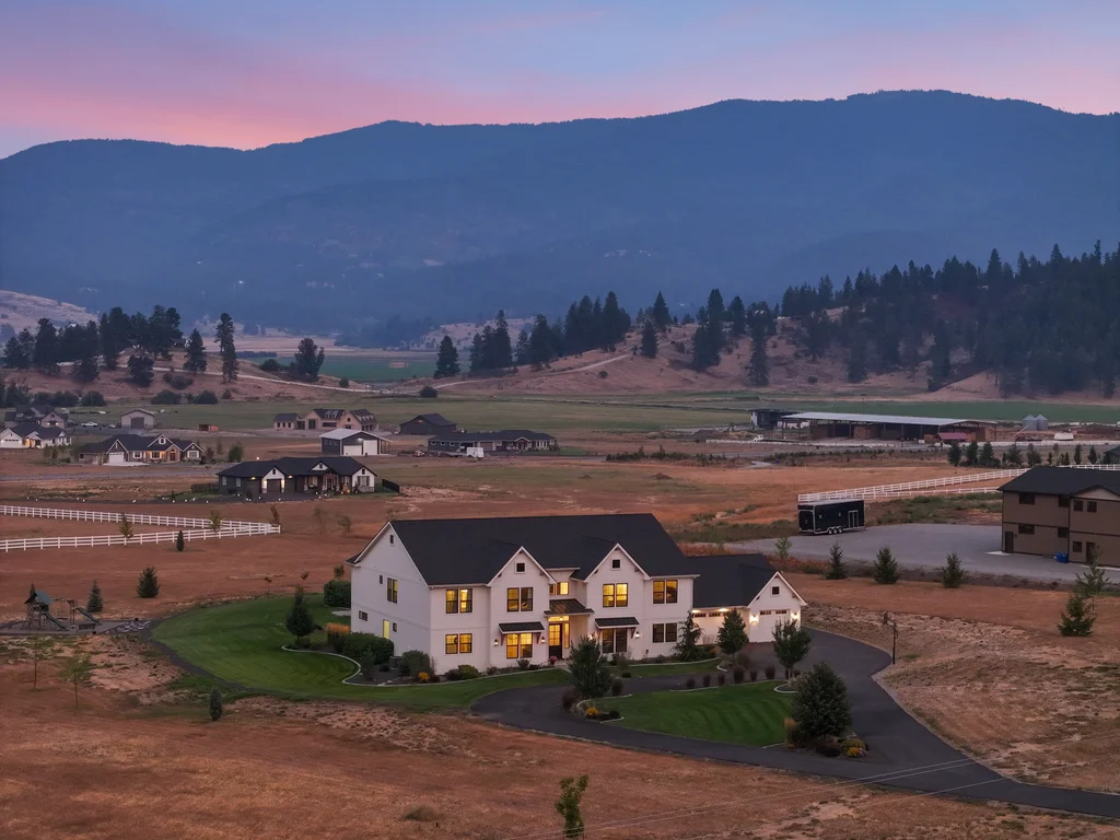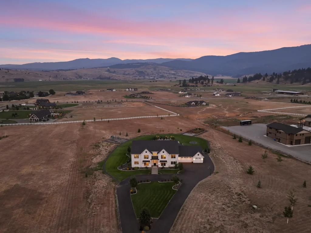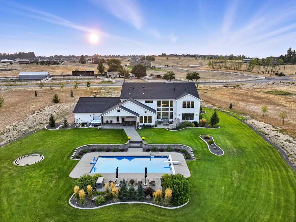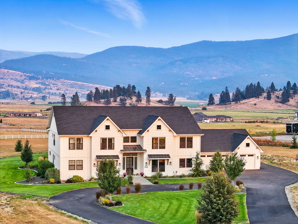 Located in sought-after Morrison Ranch, this casually elegant two-story modern farmhouse sits on five scenic acres with sweeping views of Mica Peak and the Saltese Wetlands. The open two-story great room features a dramatic floor-to-ceiling fireplace, abundant natural light, and a chef's kitchen with double islands, beautiful custom cabinetry, and high-end appliances. The main floor offers a luxurious primary suite, den/office or music room, huge pantry, and mud room/drop zone. The upper level includes a spacious family/game room, workout area, four additional bedrooms each with an adjacent bathroom. A fully finished 4+ garage offers room for 6 cars, workbench and abundant storage cabinets. The outdoor living spaces are equally impressive, showcasing expansive patios, custom fireplace w/pizza oven, a heated saltwater pool, in-ground trampoline, 30x50 fenced garden area, and a play area. This home blends comfort, style, and functionality in a spectacular setting.