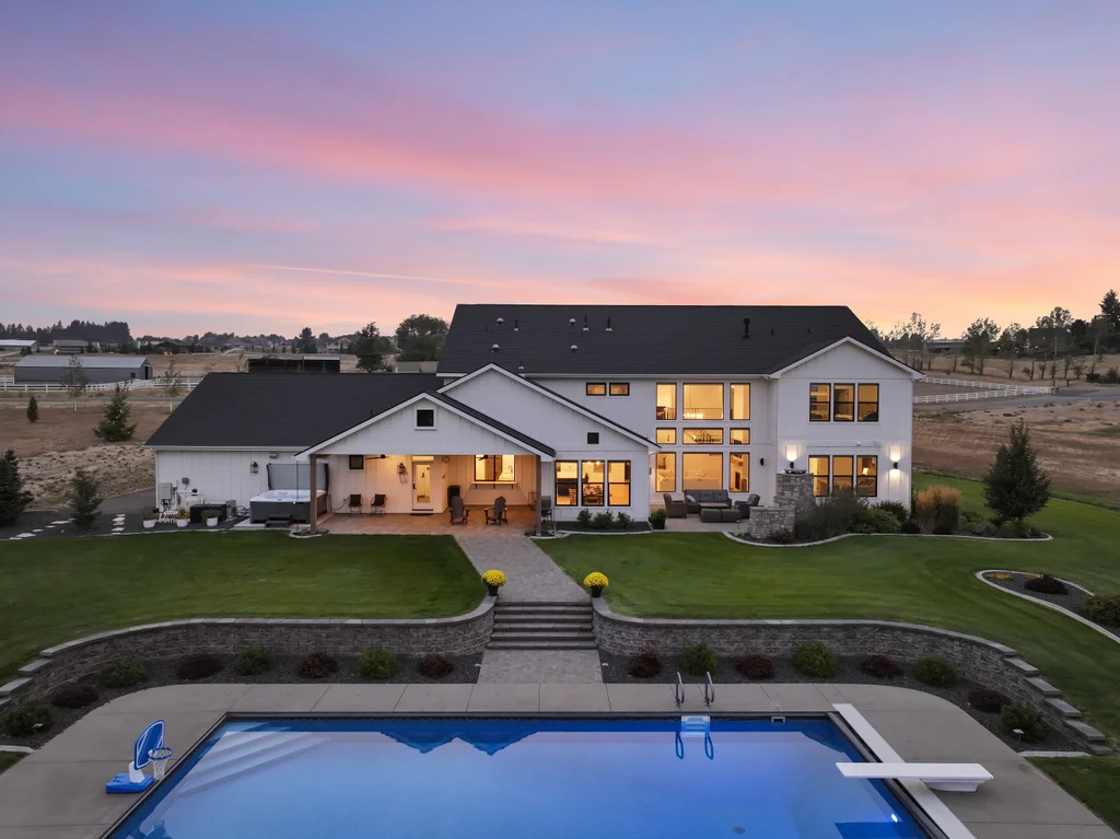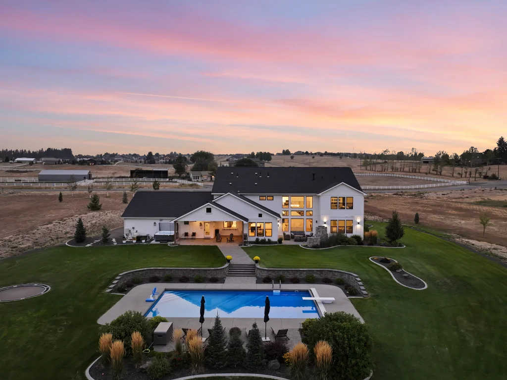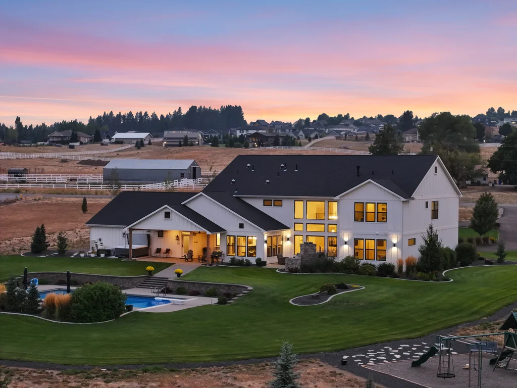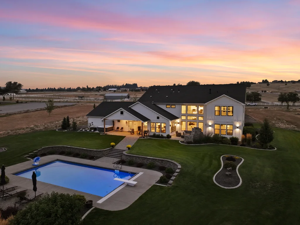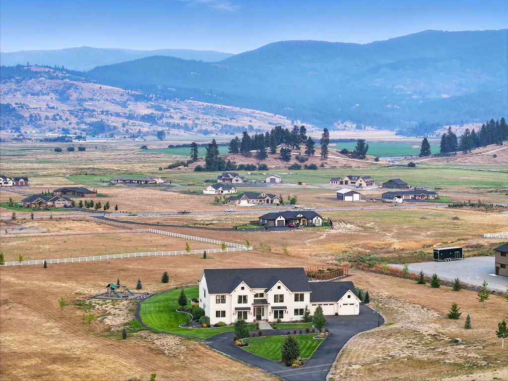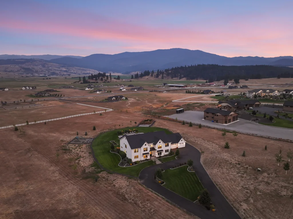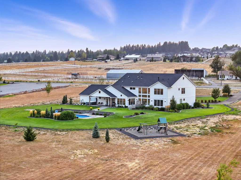 Located in sought-after Morrison Ranch, this casually elegant two-story modern farmhouse sits on five scenic acres with sweeping views of Mica Peak and the Saltese Wetlands. The open two-story great room features a dramatic floor-to-ceiling fireplace, abundant natural light, and a chef's kitchen with double islands, beautiful custom cabinetry, and high-end appliances. The main floor offers a luxurious primary suite, den/office or music room, huge pantry, and mud room/drop zone. The upper level includes a spacious family/game room, workout area, four additional bedrooms each with an adjacent bathroom. A fully finished 4+ garage offers room for 6 cars, workbench and abundant storage cabinets. The outdoor living spaces are equally impressive, showcasing expansive patios, custom fireplace w/pizza oven, a heated saltwater pool, in-ground trampoline, 30x50 fenced garden area, and a play area. This home blends comfort, style, and functionality in a spectacular setting.