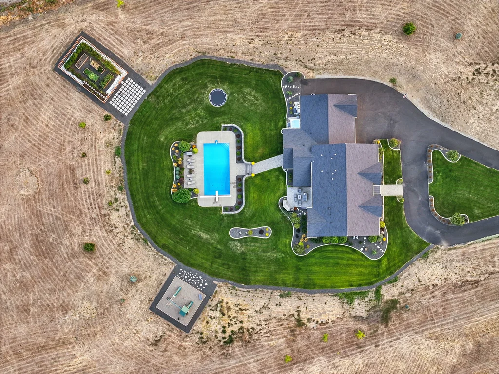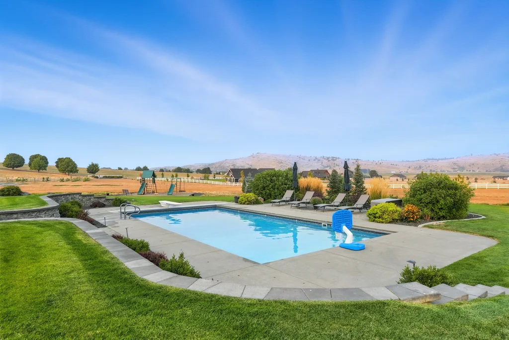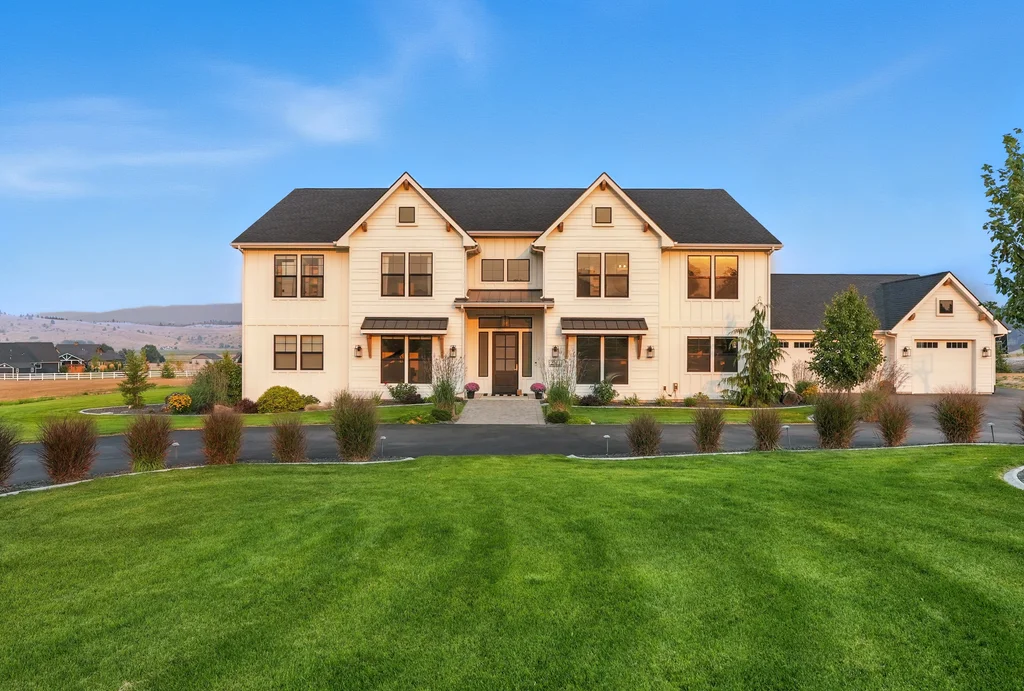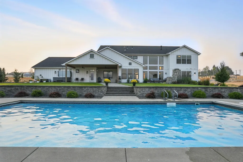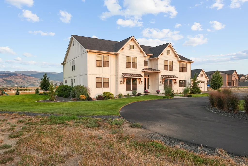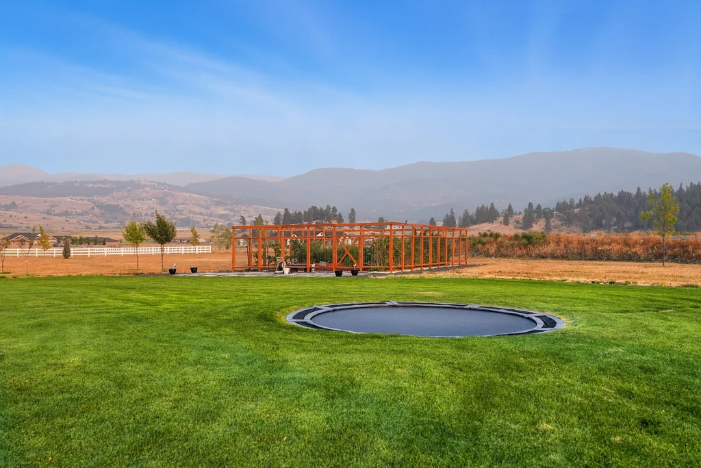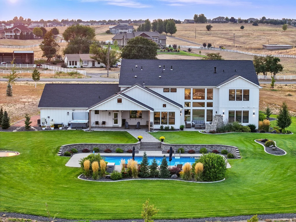 Located in sought-after Morrison Ranch, this casually elegant two-story modern farmhouse sits on five scenic acres with sweeping views of Mica Peak and the Saltese Wetlands. The open two-story great room features a dramatic floor-to-ceiling fireplace, abundant natural light, and a chef's kitchen with double islands, beautiful custom cabinetry, and high-end appliances. The main floor offers a luxurious primary suite, den/office or music room, huge pantry, and mud room/drop zone. The upper level includes a spacious family/game room, workout area, four additional bedrooms each with an adjacent bathroom. A fully finished 4+ garage offers room for 6 cars, workbench and abundant storage cabinets. The outdoor living spaces are equally impressive, showcasing expansive patios, custom fireplace w/pizza oven, a heated saltwater pool, in-ground trampoline, 30x50 fenced garden area, and a play area. This home blends comfort, style, and functionality in a spectacular setting.