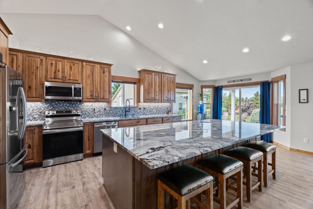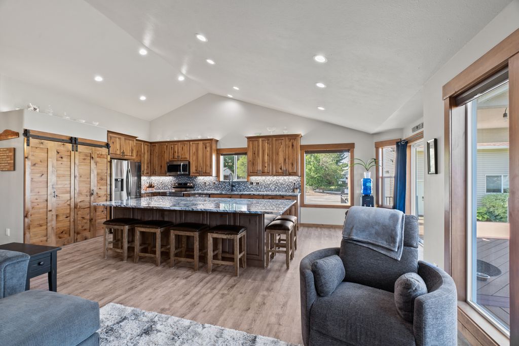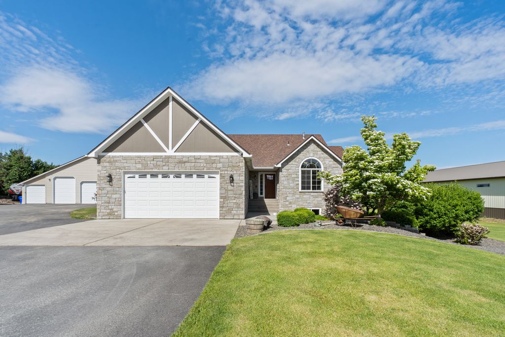 Amazing opportunity in Otis Orchards! Updated daylight rancher on 5.1 acres with territorial views. Open great-room layout with vaulted ceilings and newly remodeled upstairs—featuring fresh paint, updated flooring, kitchen remodel, and window-trim upgrades. Daylight basement includes 2 bedrooms, full bath, gas fireplace, wet bar, and walk-in fireproof gun safe. Enjoy a large deck, patio, and fire pit area. Attached 2-car garage plus 50' x 33' shop with loft, bonus room, and half bath with separate water heater. Additional 50' x 120' shop includes indoor pickleball court. Property also features a combo storage shed/chicken coop. Horses and large animals allowed. No CCRs for HOA. Newer roof on home and shop.